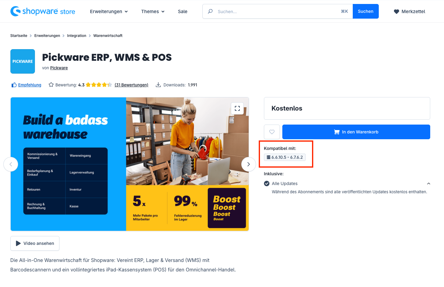 Bevor du Updates installierst, solltest du vorab immer prüfen, ob diese mit deiner Shopware Version kompatibel sind. Die unterstützten Shopware Versionen findest du beispielsweise auf der Store-Seite.