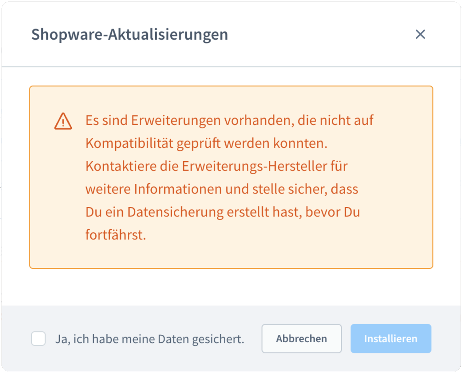 Da Pickware WMS und Pickware POS über den Pickware Account bezogen werden, kann Shopware diese Erweiterungen nicht auf Kompatibilität prüfen. Der Updater zeigt dir daher eine entsprechende Hinweismeldung an.