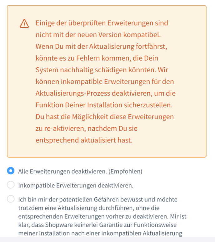 Während des Updates erscheint außerdem eine Abfrage zur Deaktivierung deiner Erweiterungen.