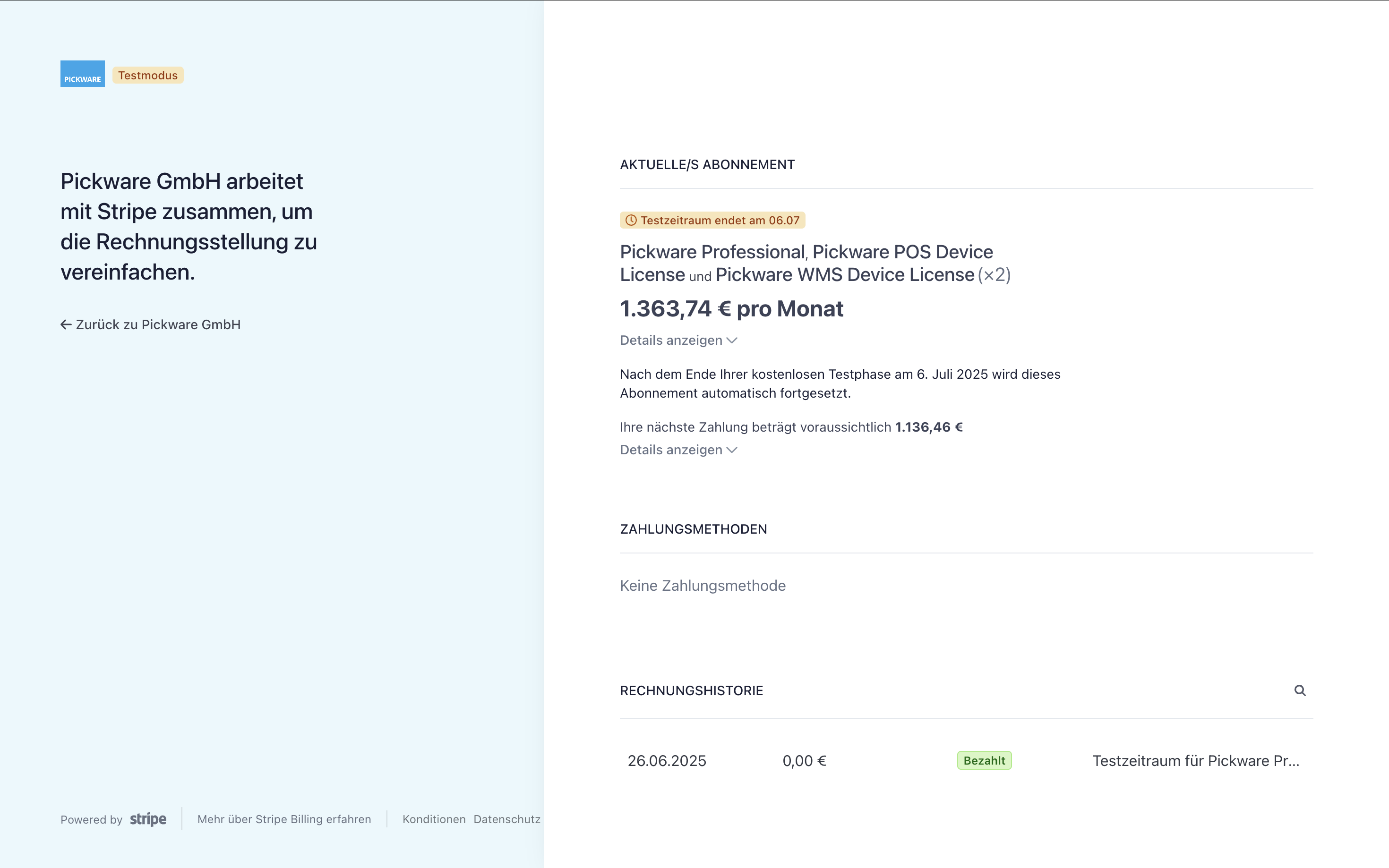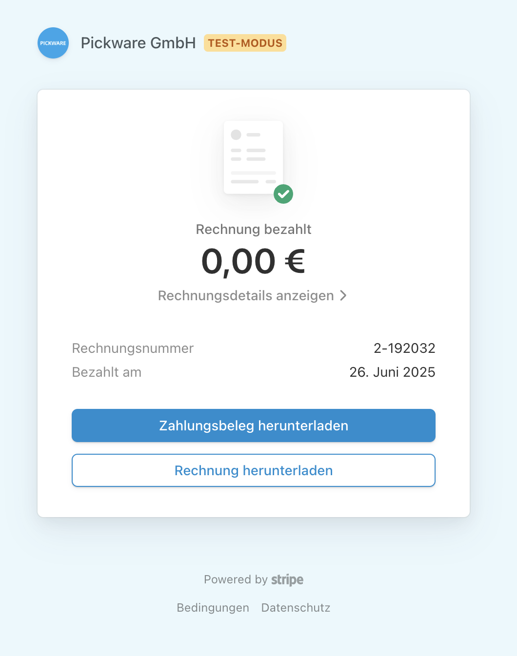 Du erhältst deine Rechnungen über die Abonnementgebühren automatisch jeden Monat per E-Mail. Zusätzlich findest du alle Rechnungen in deinem Pickware Account unter Abonnement → Rechnungen → Rechnungen anzeigen.