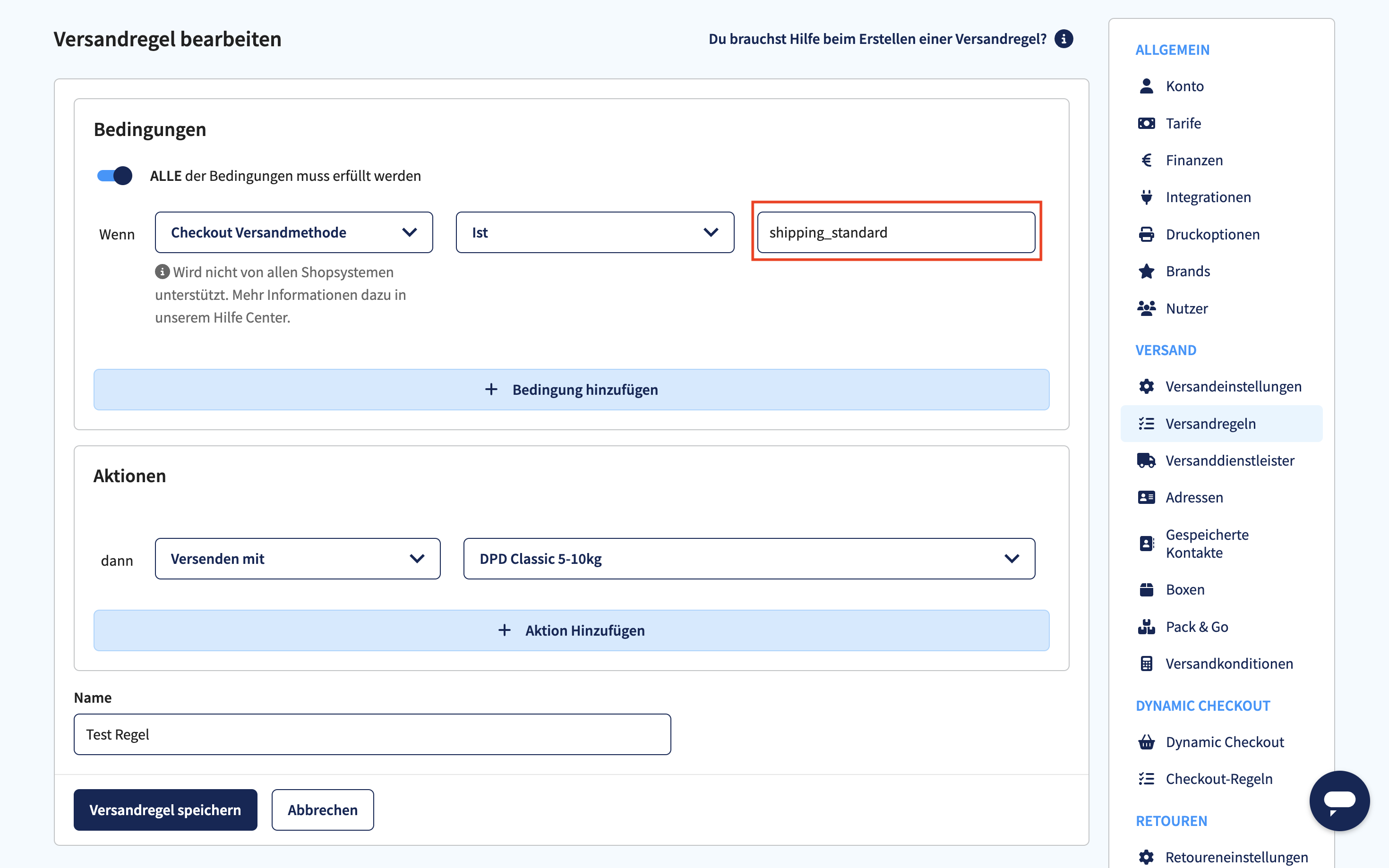 Anstelle von DPD Classic 5-10 kg kannst du ein beliebiges anderes Versandprodukt aus der Liste wählen. Du kannst ebenfalls weitere Bedingungen hinzufügen.