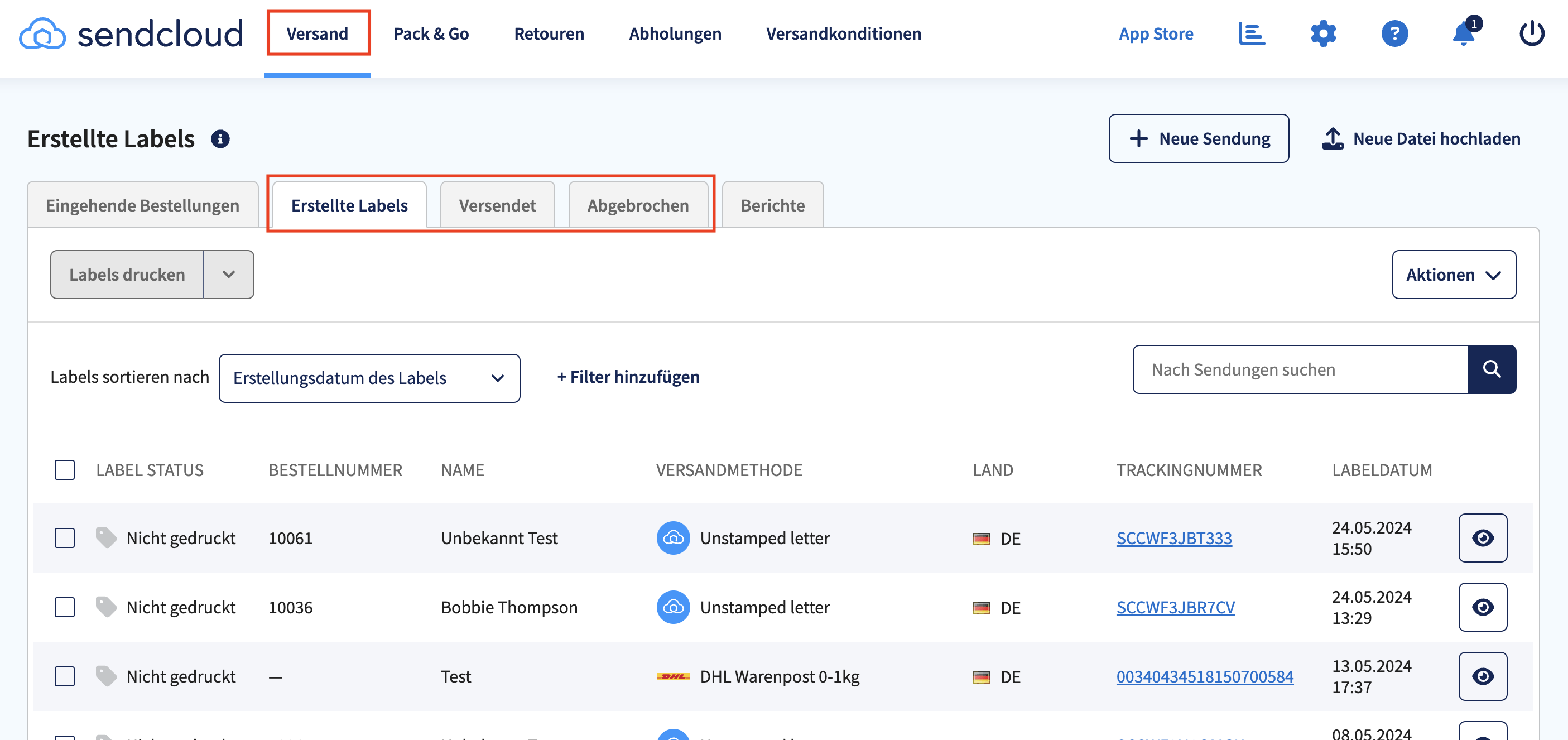 Im Sendcloud Dashboard oben unter Versand findest du alle erstellten, versendeten und stornierten Versandetiketten in den jeweiligen Tabs.